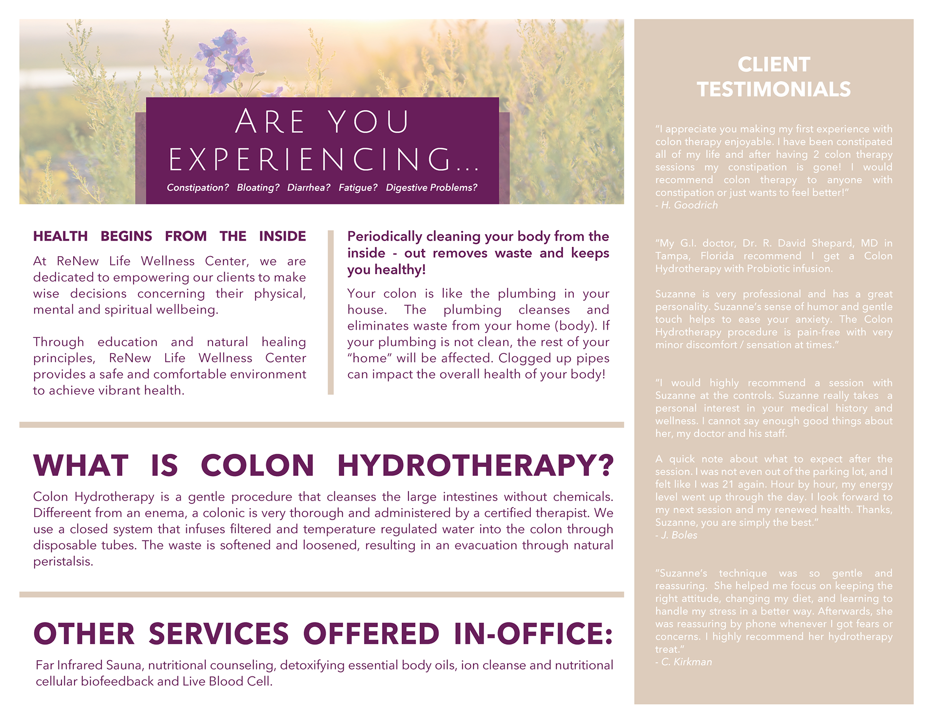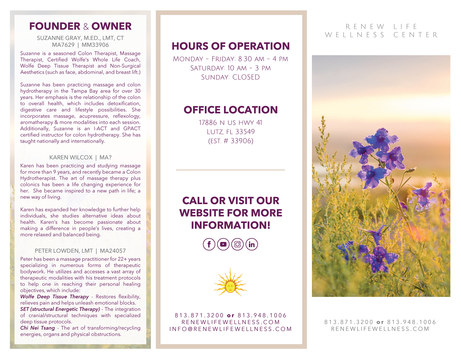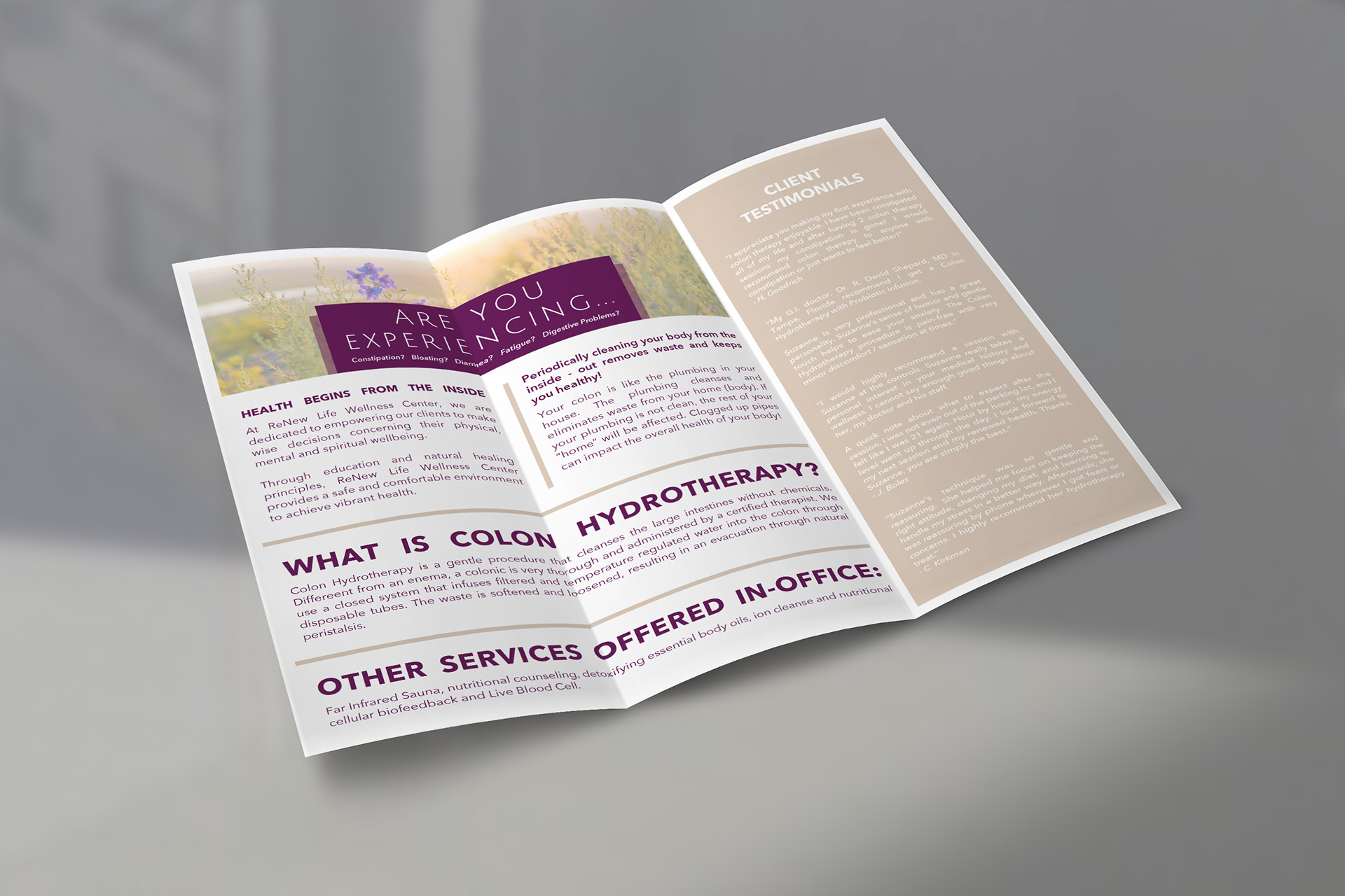 a brand new tri-fold brochure design for ReNew Life Wellness Center in Lutz, Florida to replace their old, dark, out-dated brochure designs. The idea was light, earthy and airy with hints of purple.